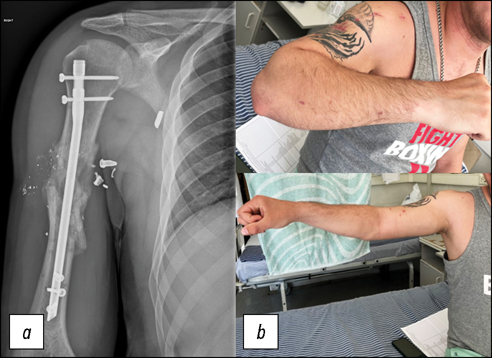 Fig. 4. Patient 1: a, radiograph after removal of the external fixation device and internal osteosynthesis with proximal locking of a femoral nail; b, the patient on the first postoperative day.