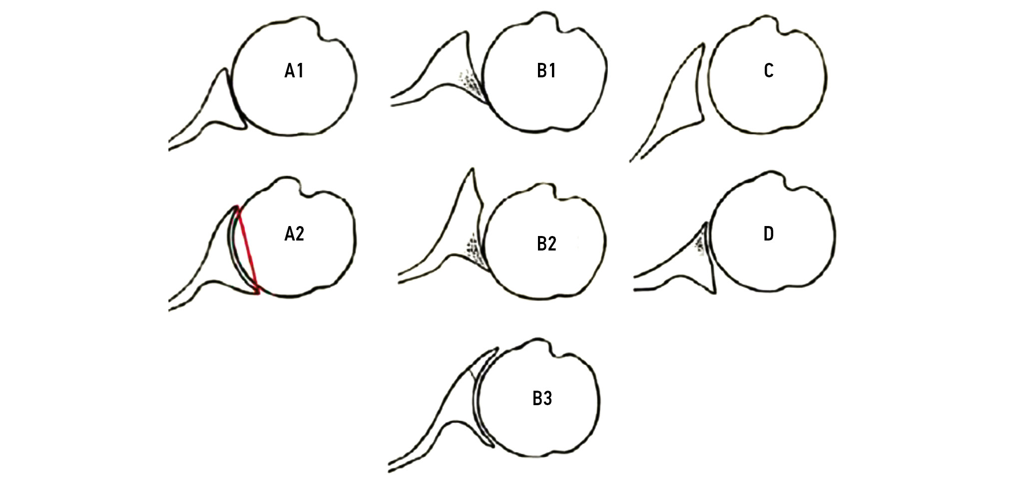 2. Fig. 1. Walch modified classification of glenoid defects in primary shoulder arthritis. Type A — central erosion of the glenoid (A1 — minimal erosion,; A2 — more significant bone loss); type B — posterior subluxation of the humerus head (B1 — narrowing of the articular gap, subchondral sclerosis and osteophytes; B2 — biconcave form of the glenoid as a result of erosion of the posterior edge; B3 — erosion of the posterior edge with pathological retroversion); type C — pathological retroversion of the articular surface of the scapula; type D — erosion of the anterior edge of the glenoid with subluxation of the humerus head anteriorly