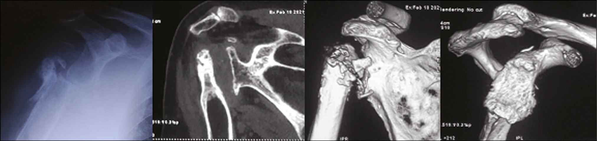 Preoperatively, clinical, radiological, and instrumental examinations of the patient were performed. Pain syndrome, joint range of motion, and functional state of the deltoid muscle were assessed. Radiographs of the shoulder joint in two projections were obtained, as well as data from multispiral computed tomography (CT) of the shoulder joint with visualization of the scapular articular process and three-dimensional modeling. This was based on CT in which the volume of the proposed reconstruction of the articular process of the scapula, which could be in several versions, was assessed.