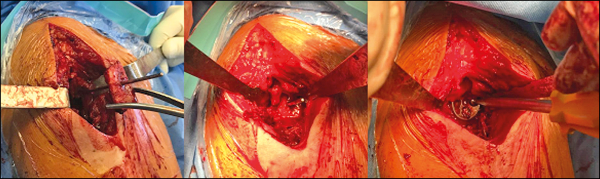 In case of the marginal defects of the articular surface of the scapula without medialization of its entire surface, bone autoplasty and graft fixation were performed, followed by endoprosthetics. Plastic repair of glenoid marginal defects was performed as follows. After surgical access to the shoulder joint, skeletonization of the glenoid articular surface was performed, and scar tissues and articular cartilage were removed. In addition to preoperative planning based on CT with three-dimensional modeling, visual, manual, and instrumental assessments of the defect parameters and the amount of bone loss in the articular surface of the scapula were performed. Then, an incision was made on the skin and subcutaneous tissue in the projection of the iliac crest. The muscle fibers were bluntly separated, the ilium surface was visualized, and the bone autograft of the required size was collected using an osteotome. Hemostasis with a layer-by-layer wound closure was performed. The graft was modeled with special instruments. After reconstruction of the graft shape corresponding to the defect, the graft was implanted into the defect area. Osteosynthesis of the graft was performed with cannulated metal or bioresorbable screws. The metaglene was installed, taking into account the inclination angle of the formed articular process of the scapula and patient’s biomechanical data (such as the presence of thoracic kyphosis). Compression and tight fit of the surfaces of all elements of the scapula–graft–metaglene system were achieved, without gaps and empty spaces. The metaglene was then fixed with screws; it was essential to place screws of the required length into the scapular body to ensure autograft compression, stability, reconstruction, and subsequent consolidation with the scapular bone tissue. Even in the absence of pronounced medialization of the metaglene and replacement of minor defects, it is advisable to choose revision metaglene with an elongated stem for a more stable fixation (Fig. 2). Fundamentally, the long stem of the metaglene should enter the body of the scapula.