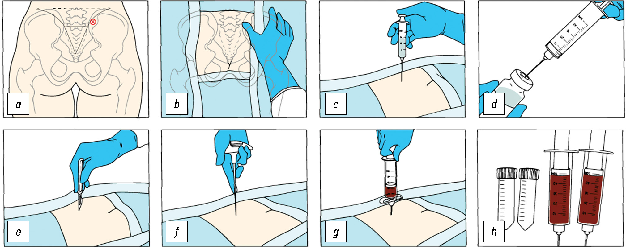 Fig. 2. Bone marrow aspiration technique: a, marking the bony landmarks of the posterior iliac crest and sacroiliac joint; b, palpation of the intervention site; c, local anesthesia; d, heparinized syringes; e, skin incision using a lancet scalpel; f, insertion of trephine biopsy needle into the bone marrow cavity of the posterior iliac crest; g, bone marrow aspiration using a 50 mL syringe; h, 100 mL of aspirated bone marrow.