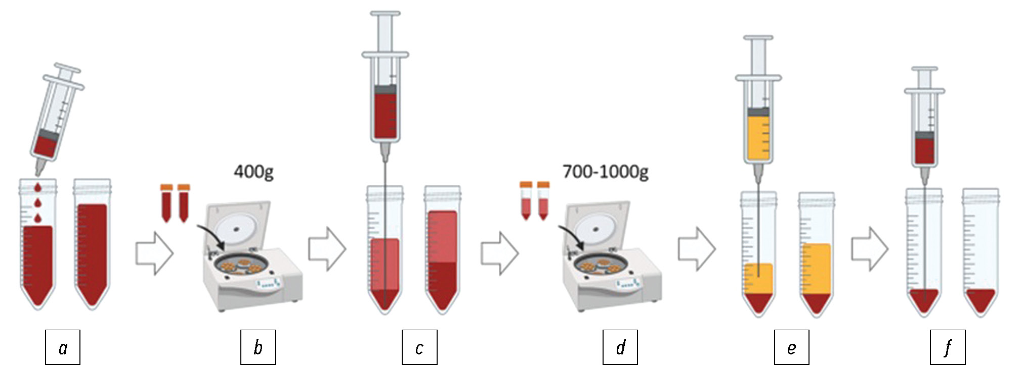 Fig. 3. Bone marrow aspirate concentrate preparation technique: a, transferring bone marrow into 50 mL centrifuge tubes; b, first centrifugation at 400g for 2 minutes, repeated 2 to 6 times; c, removal of erythrocyte sediment (20–25 mL); d, centrifugation at 1000g for 15 minutes; e, removal of the upper plasma layer from each tube; f, collection of the bone marrow aspirate concentrate into two 10 mL syringes