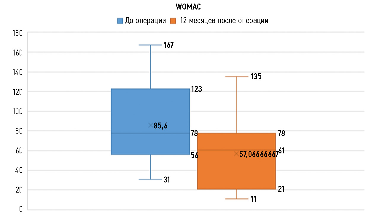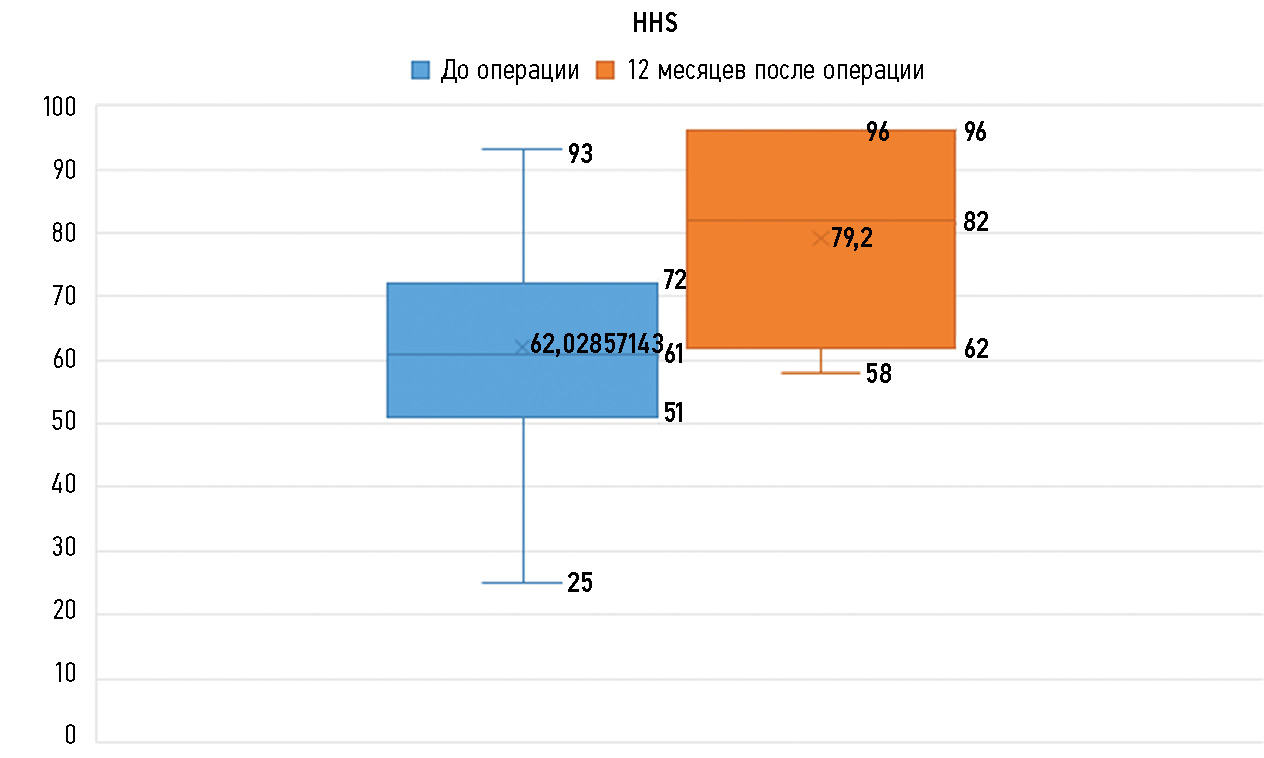 Период наблюдения составлял 12 месяцев. Оценка функциональных результатов по шкалам HHS и WOMAC, болевого синдрома по визуальной аналоговой шкале (ВАШ), качества жизни по SF-36 проводилась до операции и через 3, 6, 12 месяцев после хирургического лечения. Стадия и активность АНГБК оценивались по данным МРТ обоих тазобедренных суставов (не менее 1,5 Тесла) до операции и через 3, 6, 12 месяцев и КТ тазобедренных суставов до операции и через 6, 12 месяцев.