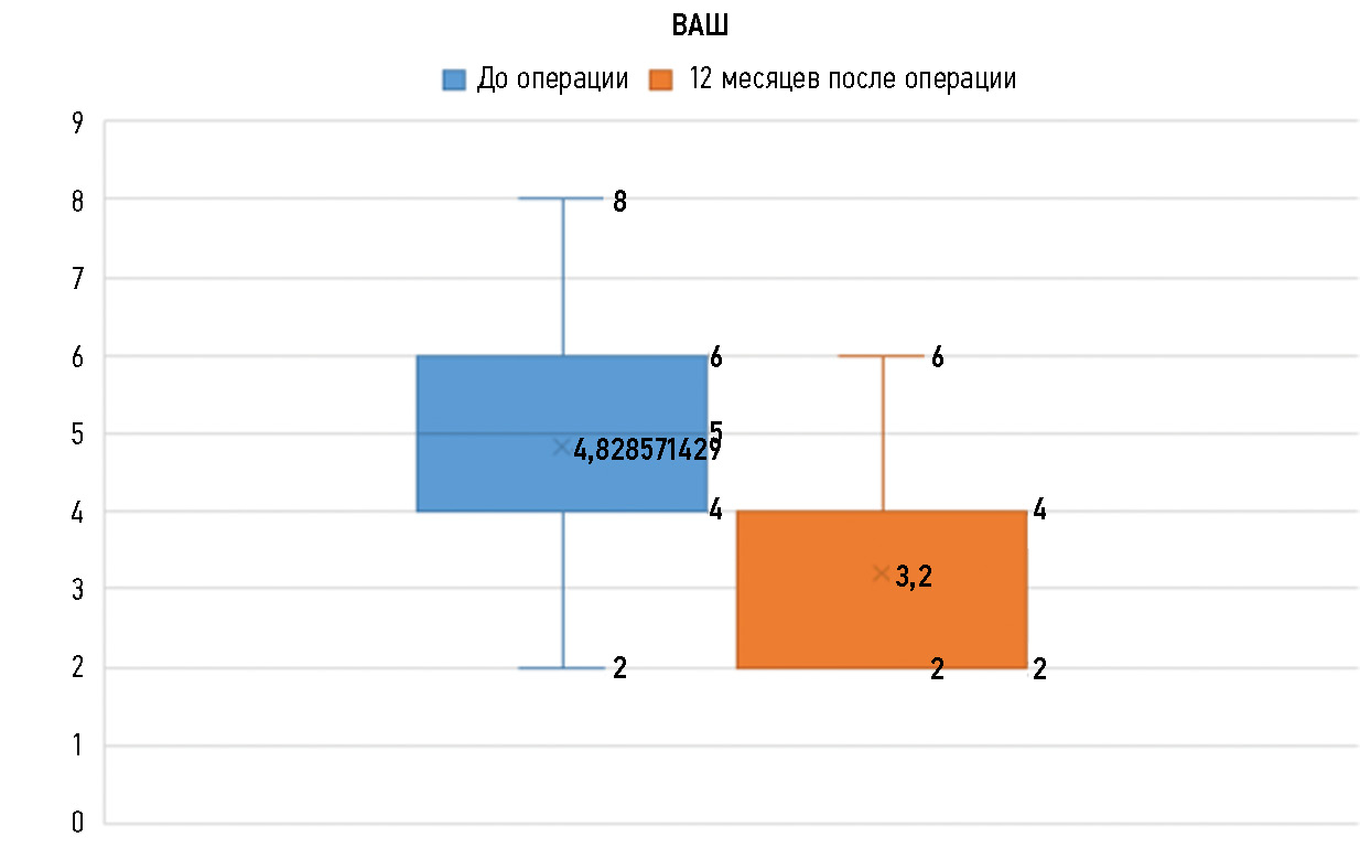 Pain levels assessed by the VAS decreased in all patients immediately after the procedure. The mean VAS score was 4.8 ± 1.3 before surgery and 3.2 ± 1.6 at 12 months. The VAS score decreased significantly after surgical treatment with bone marrow aspirate concentrate (p = 0.002; Fig. 8).