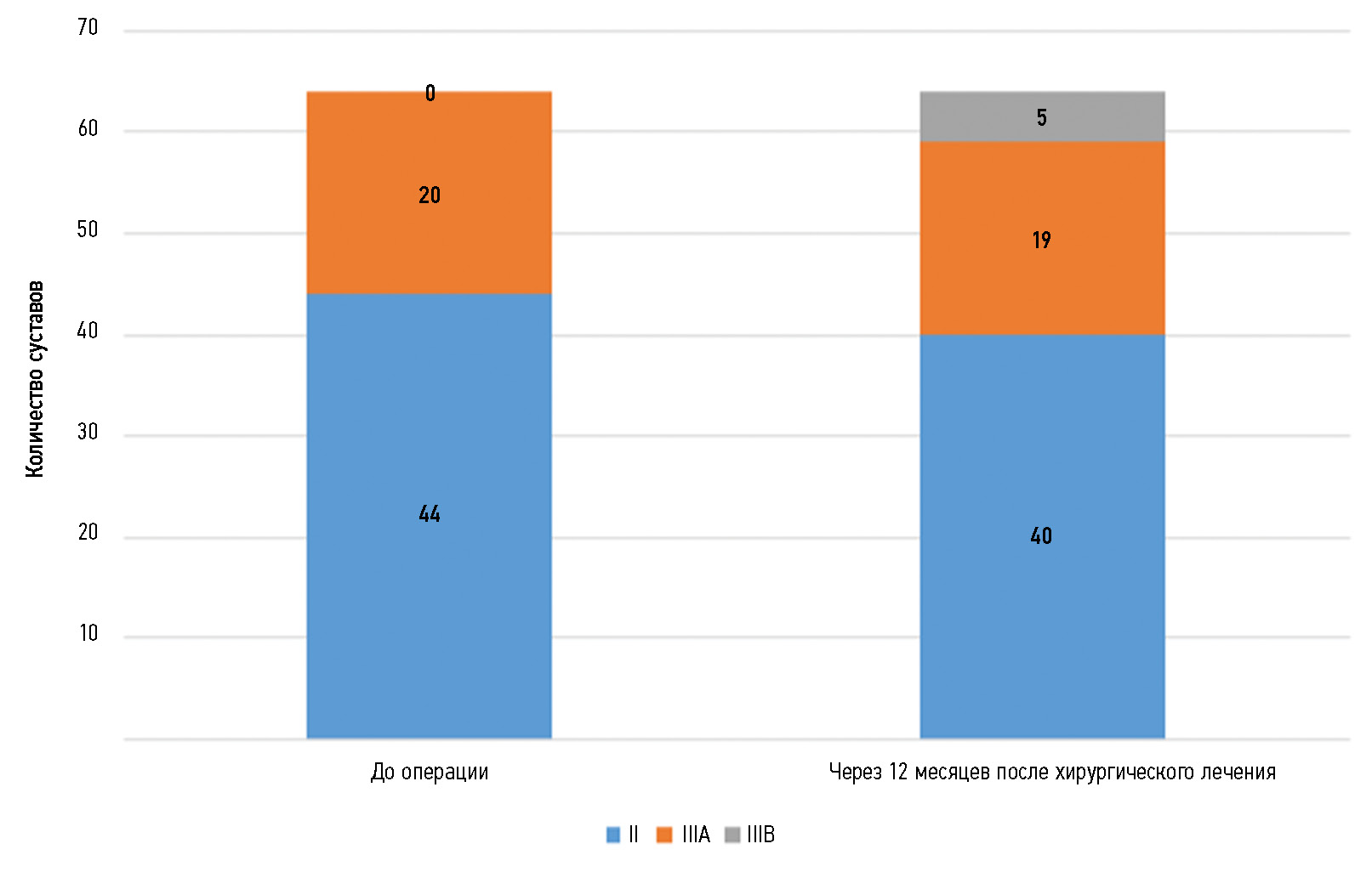 Fig. 10. Radiographic progression of avascular necrosis of the femoral head according to the ARCO classification after treatment.