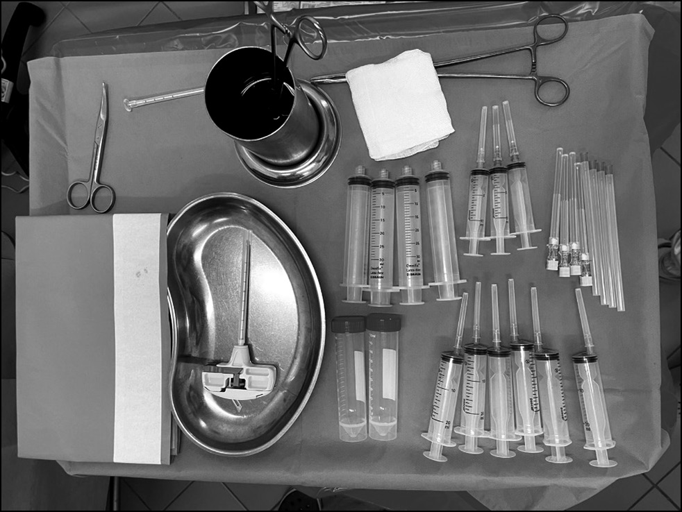 Fig. 1. Surgical table with consumables required for bone marrow aspiration and concentrate preparation.