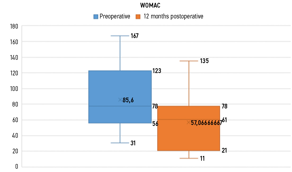 Fig. 7. Hip joint function assessment before and 12 months after core decompression with bone marrow aspirate concentrate according to the WOMAC index.