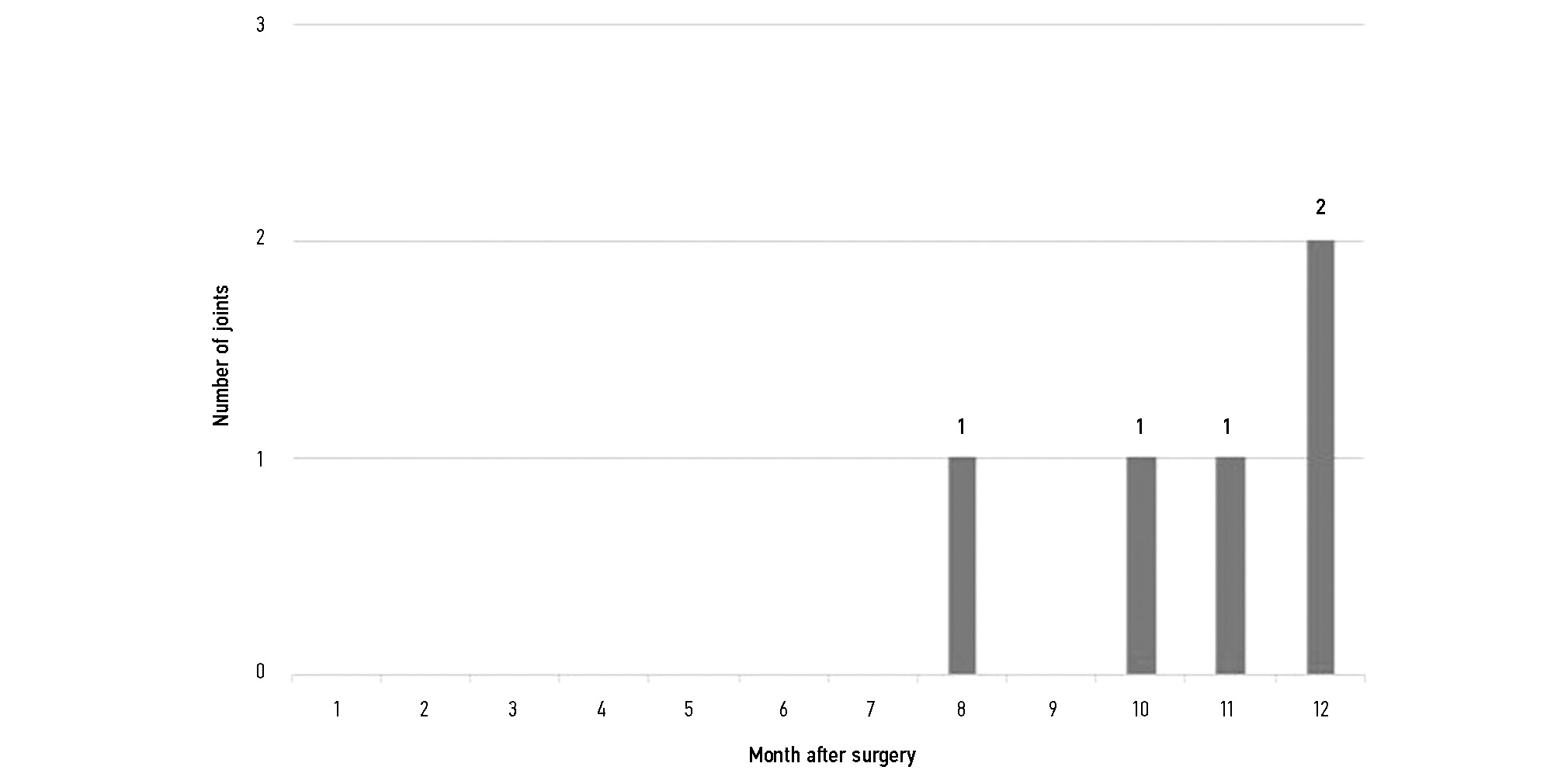 Total hip arthroplasty was required in 4 patients (5 hip joints, accounting for 7.7% of all hip joints in the study population). The indications for this surgical intervention were collapse of the articular surface and persistent pain (VAS score > 6).