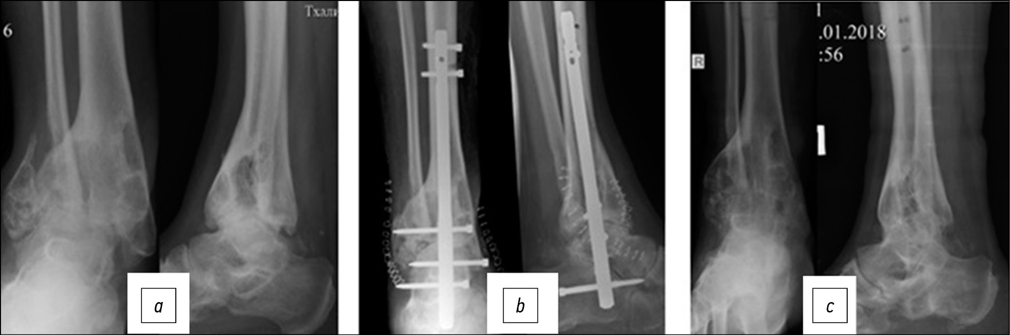 Рисунок. Рентгенография голеностопного сустава больного Т., 40 лет (а) на момент обращения, (b) после выполнения операции, (c) через 14 мес после операции, интрамедуллярный фиксатор удален