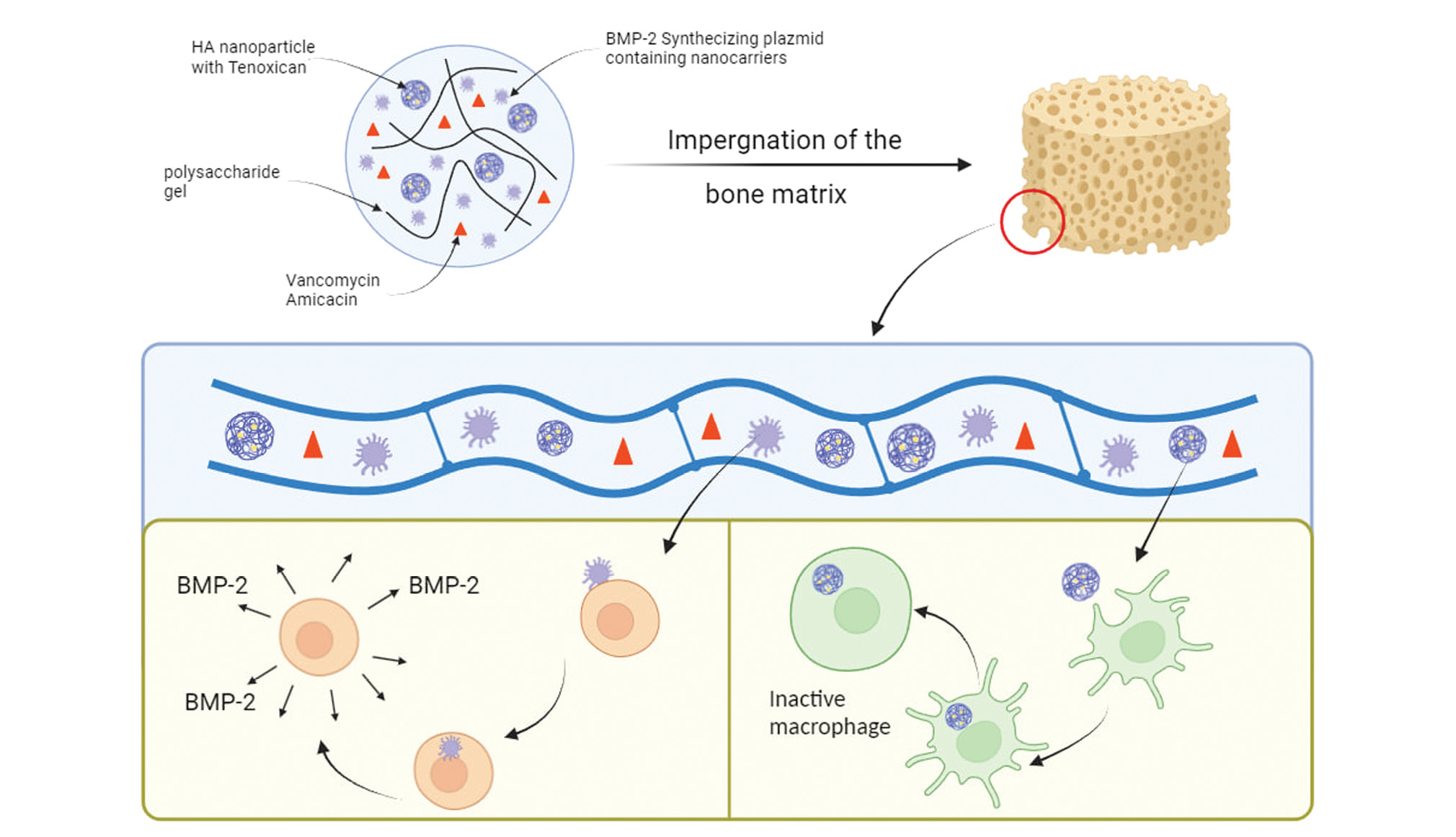 Поры костных имплантатов пропитаны полисахаридным гелем, содержащим два антибиотика — ванкомицин и амикацин, связанные ковалентно с гелем. Кроме того, в состав входит нестероидное противовоспалительное средство теноксикам, помещённое в нанокорпускулярную систему его целевого транспорта в фагоцитирующие клетки на основе гелевых наночастиц гиалуроновой кислоты, а также плазмиды, на которых в живых клетках синтезируется костный морфогенетический белок КМБ-2, стимулирующий дифференциацию клеток по костному пути. Плазмиды инкапсулированы в специальную нанокорпускулярную транспортную систему, позволяющую доставлять их в нефагоцитирующие клетки путём слияния мембран.