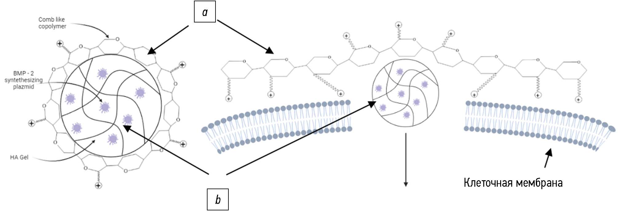 На первой стадии исследования синтезировали полисахаридные гели с лекарственной функцией и механико-реологическими свойствами, близкими к свойствам мягких тканей. Они содержат амикацин, ванкомицин, теноксикам и плазмиду, кодирующую костный морфогенетический белок (КМБ), обеспечивающие имплантатам локальное антибактериальное и направленное противовоспалительное действие в сочетании со стимулированием роста костной ткани. Для внутриклеточной доставки фармсубстанций в гель вводили два вида нанокорпускулярных носителей разного диаметра: гиалуроновые гелевые наночастицы с бимодальным распределением по размерам d=100 и 3000 нм. Крупные частицы содержат теноксикам, обеспечивают его доставку внутрь фагоцитирующих иммунокомпетентных клеток и, соответственно, контролируют локальное воспаление. Мелкие гиалуроновые нанокапсулы d=50–100 нм покрыты агентом трансфекции, обеспечивают трансмембранный транспорт плазмиды в нефагоцитирующие клетки, рибосомами которых синтезируется морфогенетический белок КМБ-2, инициирующий дифференциацию клеток по костному пути. Для обеспечения локального антибактериального эффекта с гелем ковалентно связаны два антибиотика — амикацин и ванкомицин. Эти препараты высвобождаются из носителя только в момент бактериальной атаки имплантата под действием бактериальных ферментов, обеспечивая локальную концентрацию, в 200 раз превышающую бактерицидную. Общая схема дизайна биокомпозитных костнозамещающих материалов представлена на рис. 1.