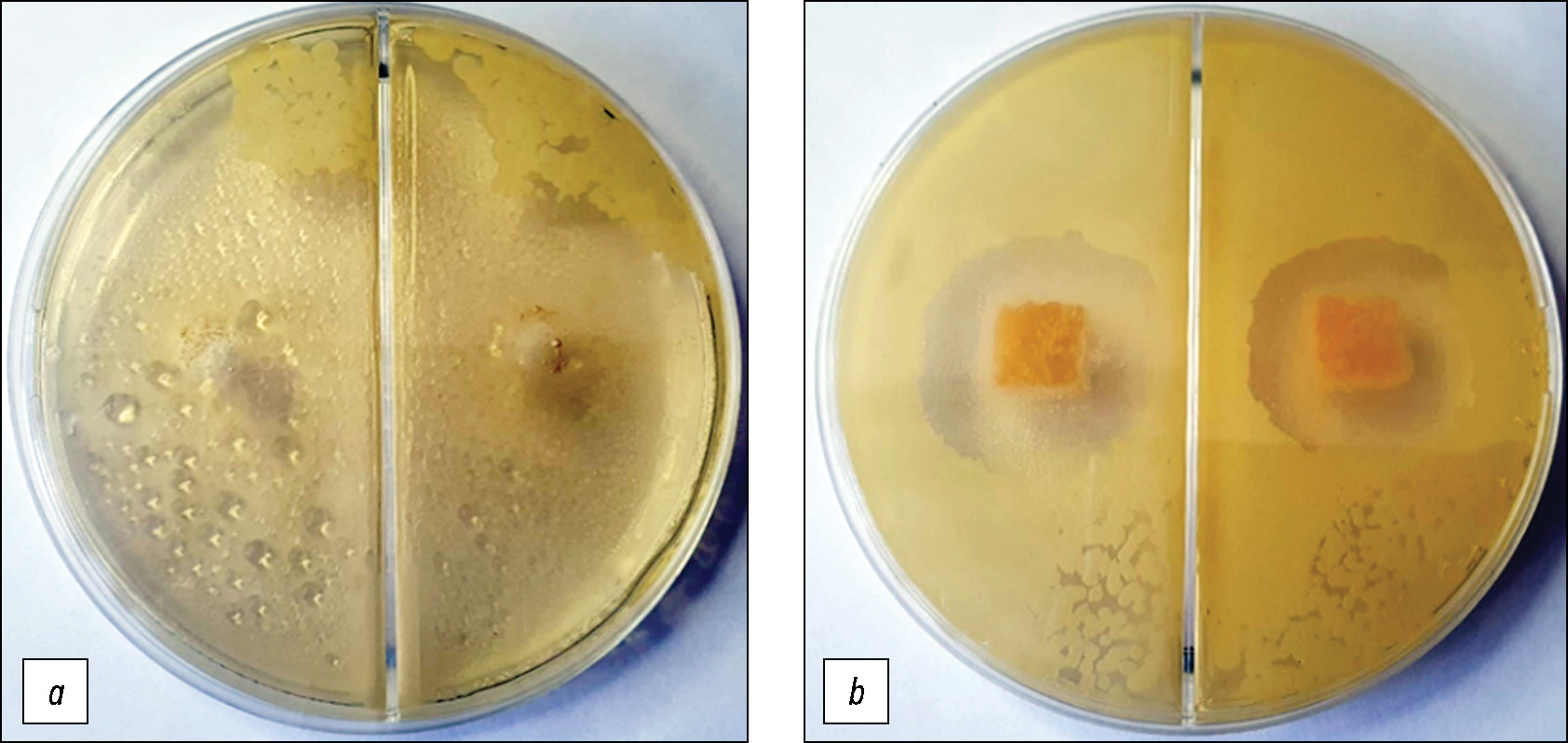 Для определения антимикробной активности геля и биокомпозитов, способных к высвобождению физиологически активных веществ, под влиянием ферментов бактерий использовали метод дисковой диффузии. Эксперимент проводили в течение недели. Инокуляция проводилась культурой бактерий Staphylococcus aureus 209P в концентрации 4×106 КОЕ/мл.
