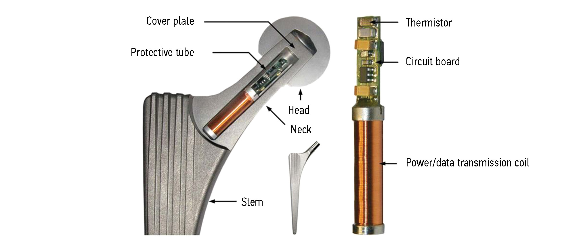 Fig. 1. Cross-sectional view of a modified hip joint endoprosthesis model. Temperature telemetry with thermistor, electronic circuitry and power/data coil are located inside the implant neck [49].