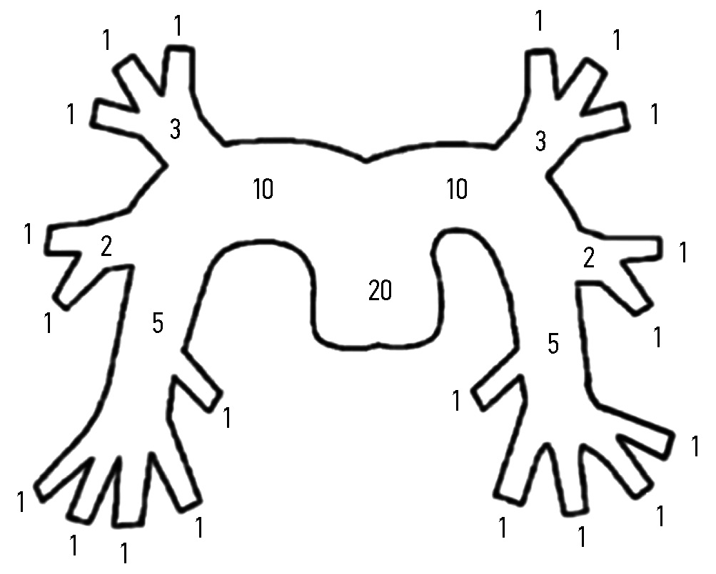 Для изучения особенностей лучевой семиотики ТЭЛА при COVID-19-ассоциированной пневмонии был использован индекс Кванади, впервые описанный S.D. Qanadli и соавт. [10], являющийся аналогичным индексу Миллера и адаптированный под МКСТ-АГ (рис. 1).