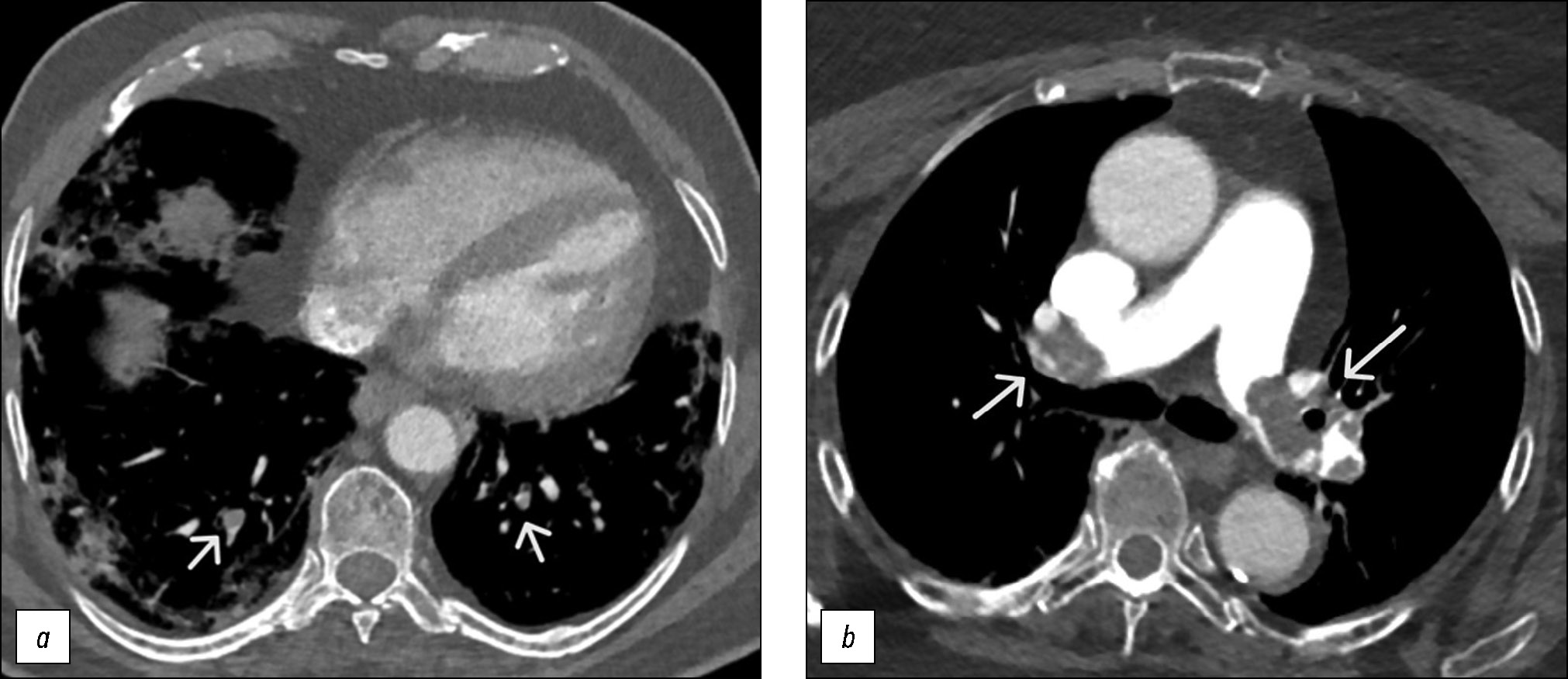 Исследование показало, что мультиспиральная компьютерная томография с контрастным усилением является информативным методом диагностики тромбоэмболии лёгочных артерий у пациентов с COVID-19-ассоциированной пневмонией. У каждого пятого из 176 обследованных пациентов была выявлена ТЭЛА. При этом у большинства из них отмечалась лёгкая степень перфузионного дефицита и периферическая локализация тромбоэмболов (в 63,8% случаев — в сегментарных и субсегментарных ветвях лёгочных артерий). Статистически значимой зависимости между наличием ТЭЛА и степенью тяжести / стадией пневмонии не выявлено.
