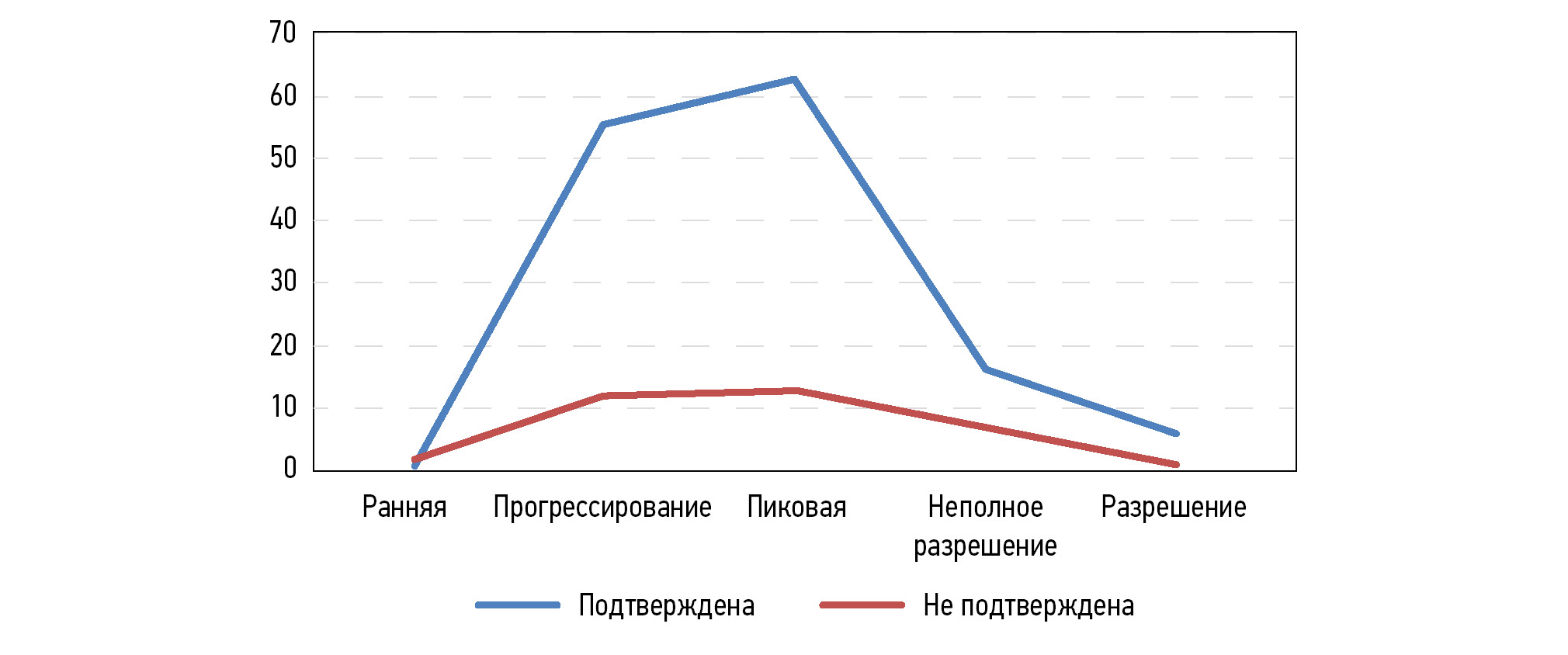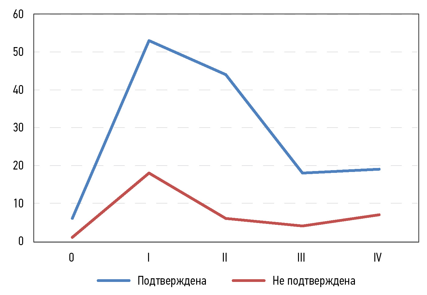 Рис. 4. Взаимосвязь стадий пневмонии у групп пациентов с подтверждённой и неподтверждённой тромбоэмболией лёгочной артерии.