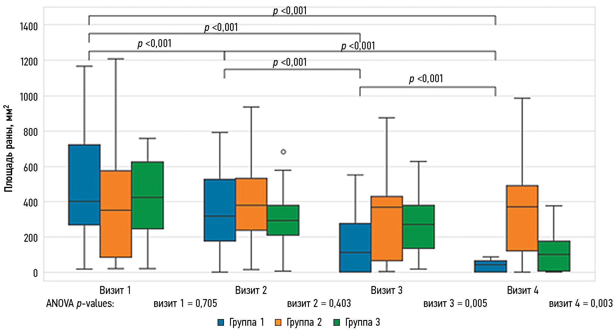 Исходные характеристики ран в группах были сопоставимы (p >0,05) (рис. 1): средняя площадь раны варьировала от 412,6±327,1 до 508,6±377,4 см². Преобладали раны II степени по шкале Wagner (54,5–66,7%), умеренная или обильная экссудация наблюдалась у 59,1–83,3% пациентов.