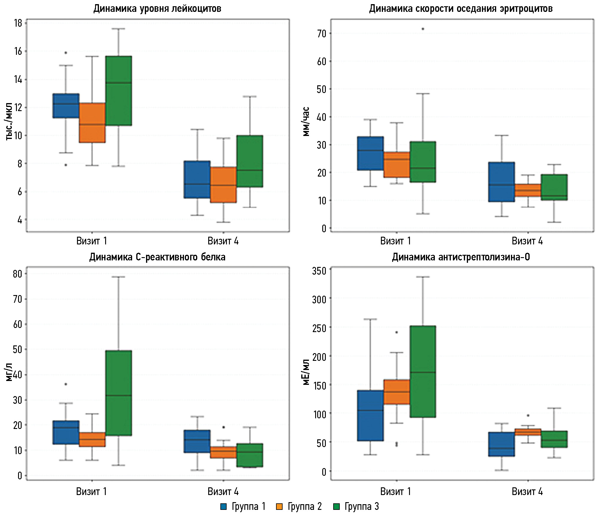 Динамика показателей анализа крови свидетельствовала об эффективности всех трёх препаратов (рис. 3). По таким параметрам, как уровень лейкоцитов (тыс/мкл) и скорость оседания эритроцитов (мм/час), С-реактивный белок, уровень антистрептолизина-О, были выявлены статистически значимые положительные изменения. Следует отметить, что уровень антистрептолизина-О к концу исследования различался между группами наблюдения (p=0,009), оставаясь более высоким в группе 3 в сравнении с другими группами.