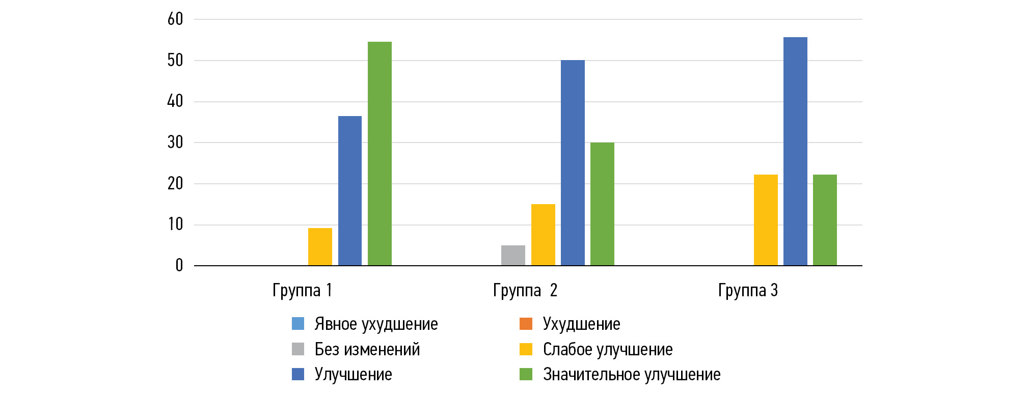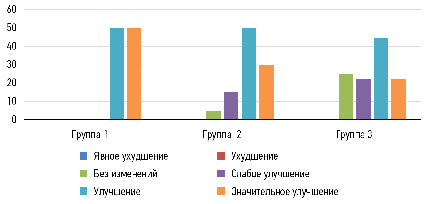 Субъективная оценка эффективности лечения пациентами и врачами различалась между группами. Наибольшая удовлетворённость лечением отмечена в группе 1, где 54,5% пациентов (12 из 22) оценили своё состояние как значительное улучшение (рис. 4). Это существенно превышает аналогичные показатели в группах 2 (30%, 6 из 20) и 3 (22,2%, 4 из 18). Важно отметить, что ни один пациент ни в одной из групп не отметил ухудшения состояния. Мнение врачей подтвердило преимущество лечения в группе 1 (χ²=14,32, p=0,006) (рис. 5). В этой группе 50% пациентов (11 из 22) были отнесены к категории «значительное улучшение», что в два раза превышает показатель группы 3 (22,2%, 4 из 18). Разница между группами 1 и 2 (25%, 5 из 20) не достигла статистической значимости после поправки (p=0,084), но сохраняла клиническую важность. В группе 1 отсутствовали пациенты с нейтральной или слабой динамикой по оценке врачей, в то время как в других группах такие случаи отмечались.