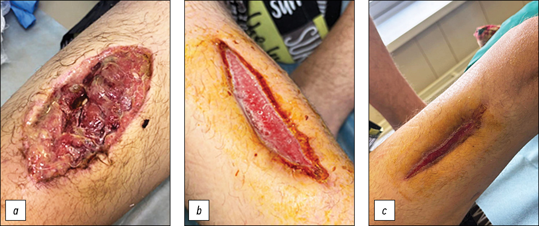 Лечение включало ежедневную обработку ран в течение срока наблюдения. Оценивались динамика заживления раны (площадь, глубина, объём экссудации), болевой синдром, микробиологические и биохимические показатели.
