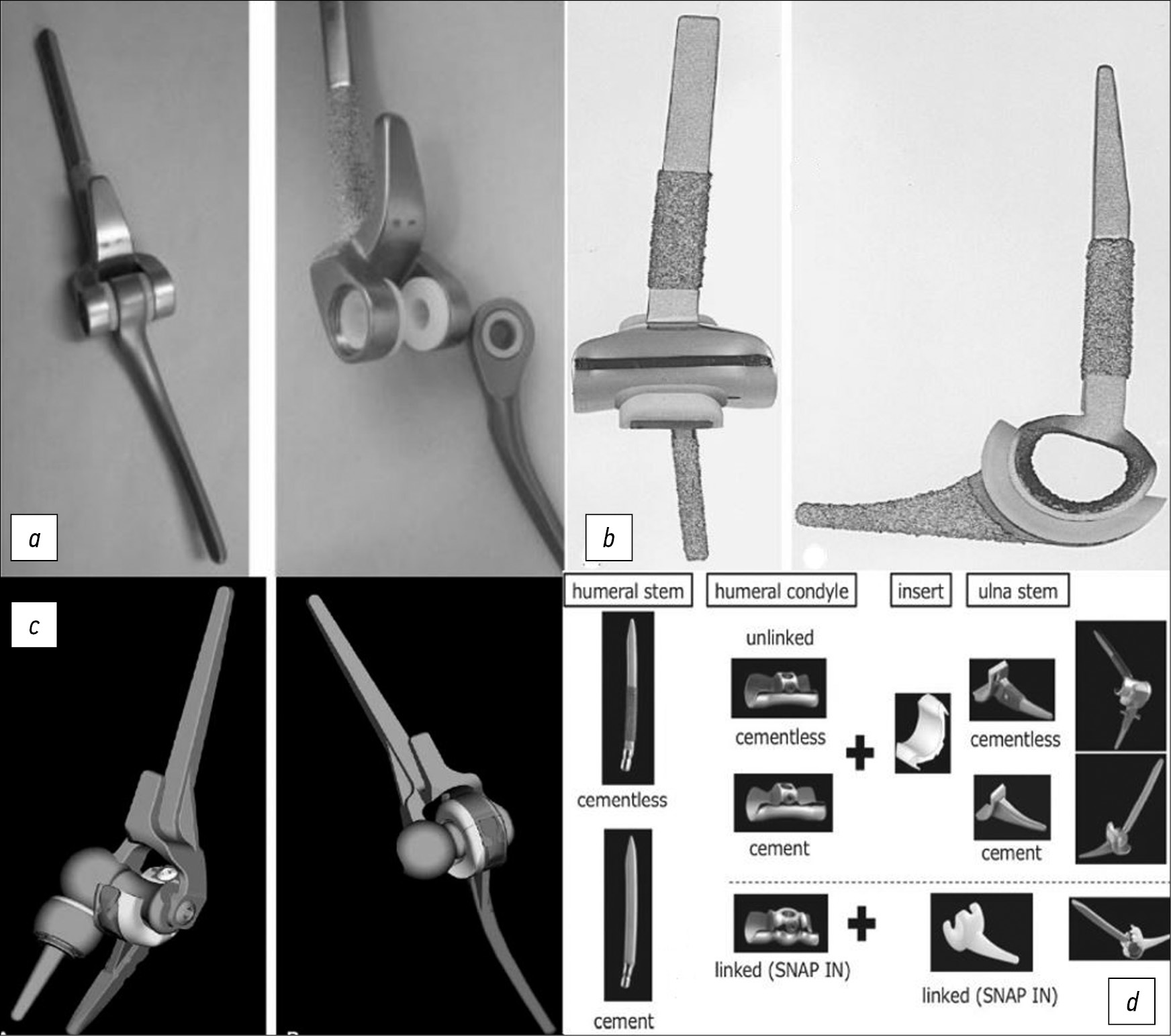Figure. Types of elbow joint endoprostheses. a — Coonrad-Morrey linked endoprosthesis (Zimmer-Biomet); b — unlinked endoprosthesis Kudo-5 (Zimmer-Biomet); c — Latitude (Tornier) convertible endoprosthesis; d — modular system K-NOW total elbow system (Teijin Nakashima Medical Co., Ltd., Okayama, Japan)