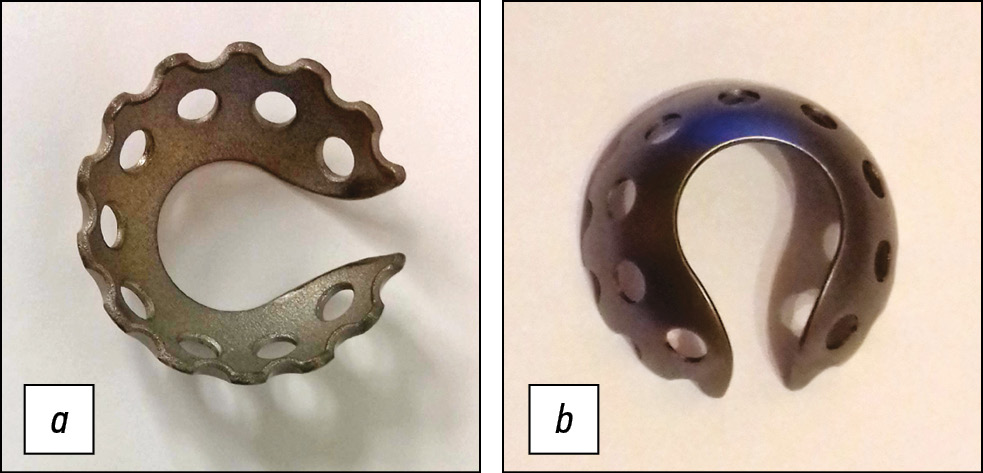 Рис. 1. Универсальное репозиционно-фиксационное кольцо с внешним диаметром 52 мм для оперативного лечения при переломах вертлужной впадины: а — вид со стороны внутренней поверхности; b — вид со стороны наружной поверхности