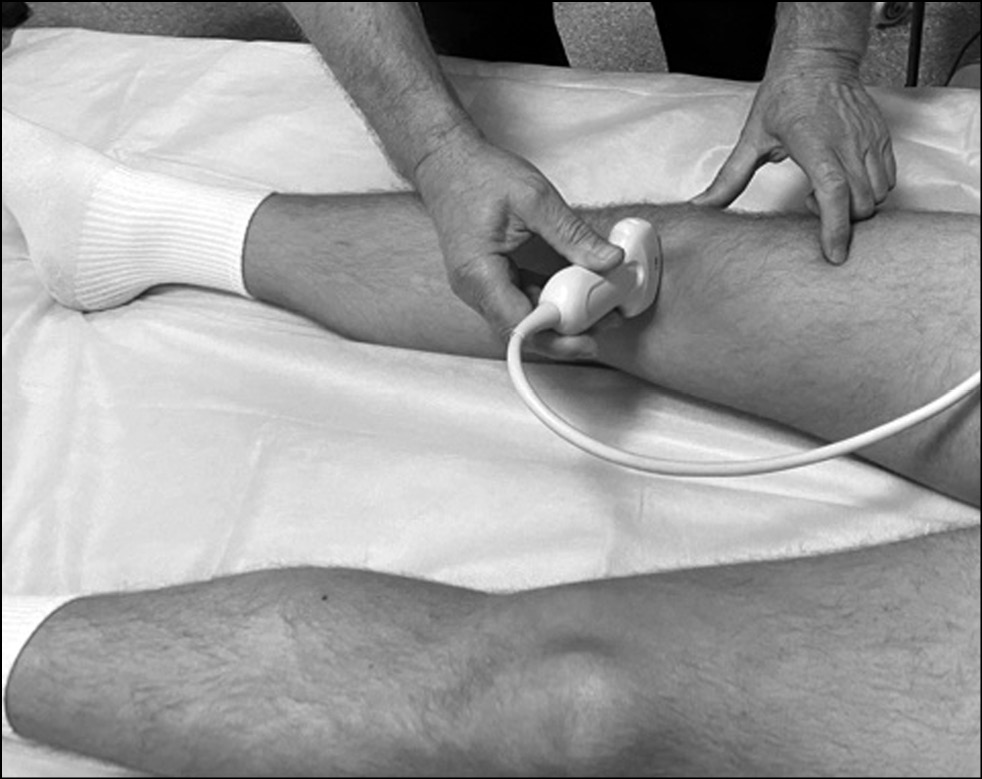Fig. 2. Location of the limb and transducer during sonography of the mediopatellar synovial fold, as well as the dynamic test