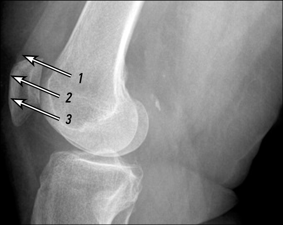 Fig. 4. X-ray of the knee joint. Positions of the ultrasonic transducer during the study: 1 — the transducer is located incorrectly, more proximally; 2 — the sensor is in the correct position; 3 — the sensor is located incorrectly, more distally