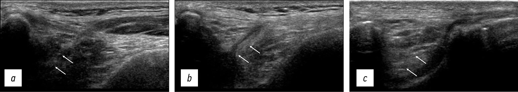 Fig. 5. Knee joint sonograms: a — sonogram when the sensor is located in the X-ray position 1, more proximally; b — sonogram when the sensor is located in the X-ray position 2, correct; c — sonogram when the sensor is located in X-ray position 3, more distally. Arrows indicate the mediopatellar synovial fold