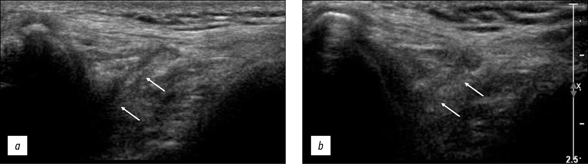 Рис. 6. Сонограммы до (а) и после (b) проведения динамического теста. Стрелками обозначена медиопателлярная синовиальная складка