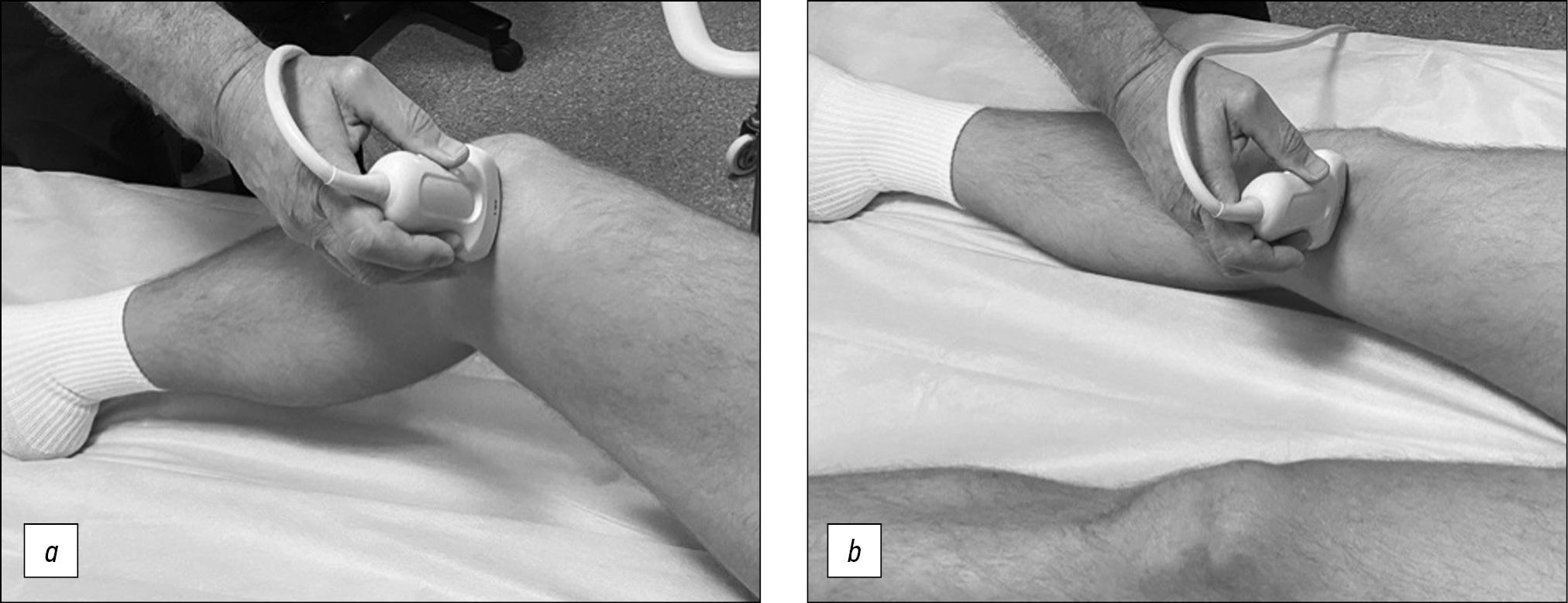 Рис. 7. Положение датчика и конечности при исследовании медиопателлярной синовиальной складки (а) и проведении динамического теста (b)