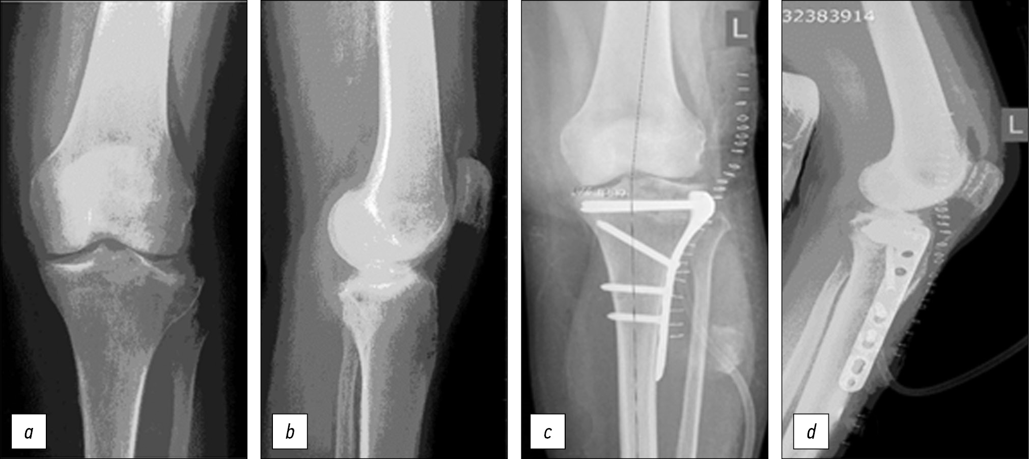 Figure. Radiographs of the knee joint of a 65-year-old female patient: a, b — on admission: malunion of the proximal tibia fracture. On radiographs of the knee, valgus deformity with impression of the lateral condyle of the tibia was determined; c, d — intra-articular osteotomy of the posterior and central part of the lateral condyle was performed, osteotomy and reduction of the osteochondral fragment, filling of the bone defect formed during the elevation of the articular surface with an allograft, fixation with an LCP PTP. The congruity of the articular surface was restored, the deformity was corrected.