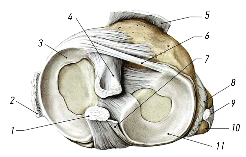 Fig. 2. Knee meniscus ligaments: 1 — posterior cruciate ligament; 2 — tribal collateral ligament; 3 — medial meniscus; 4 — anterior cruciate ligament; 5 — patellar ligament; 6 — transverse ligament of knee; 7 — posterior meniscofemoral ligament; 8 — tribiofibular joint, superior tribiofibular joint; 9 — fibular collateral ligament; 10 — head of fibula; 11 — lateral meniscus.