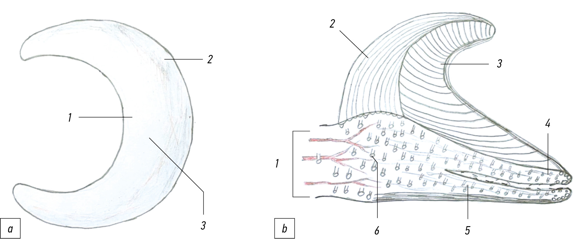 Fig. 3. The histological structure of the meniscus: a — meniscus view from above (1 — white zone; 2 — red zone; 3 — border (red-white) zone; b — meniscus view in cross section (1 — vessels; 2 — parallel oriented fibers; 3 — radially oriented fibers; 4 — surface layer cells; 5 — chondrocyte-like cells; 6 — fibroblast-like cells.