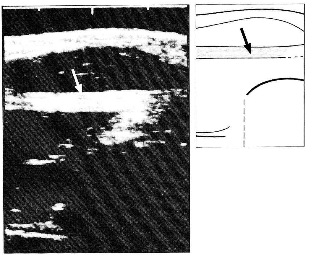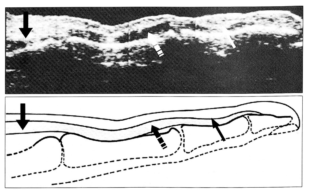 На продольных сонограммах хорошо визуализируется поверхность кожи. Подкожная жировая клетчатка обладает средней или несколько пониженной эхогенностью. Мышцы определяются как область еще более низкой эхогенности с мелкими линейными вкраплениями. Хорошо различимы суставные щели межфаланговых и пястно-фаланговых суставов. Кости служат анатомическим ориентиром при сонографии сухожилий. Если целость кости сохранена, надкостница является препятствием для дальнейшего распространения ультразвуковых лучей. Отражение лучей на поверхности кости проявляется в виде контура — яркой эхогенной линии, за которой следует акустическая тень. Места прикрепления сухожилий к кости четко определяются на фоне гиперэхогенной надкостницы.