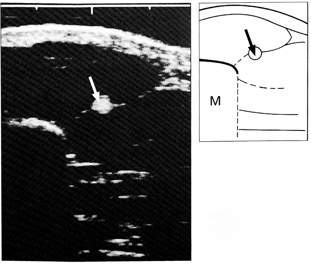 Рис. 2. Поперечная сонограмма сухожилия (стрелка) длинного сгибателя I пальца в области тенара (М — I пястная кость).