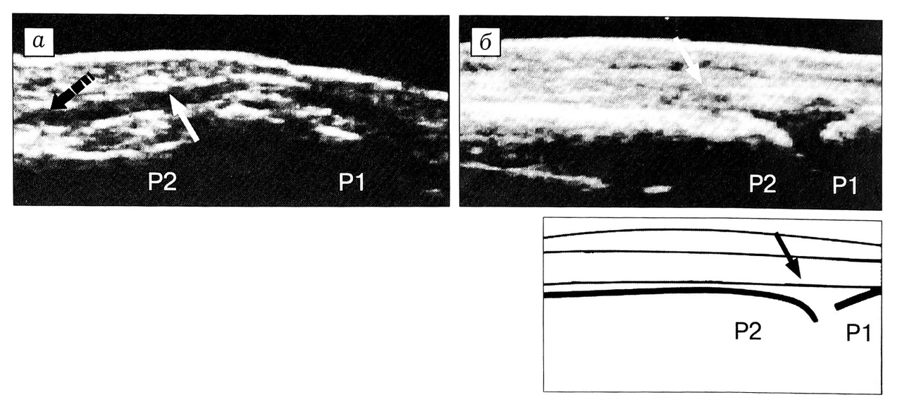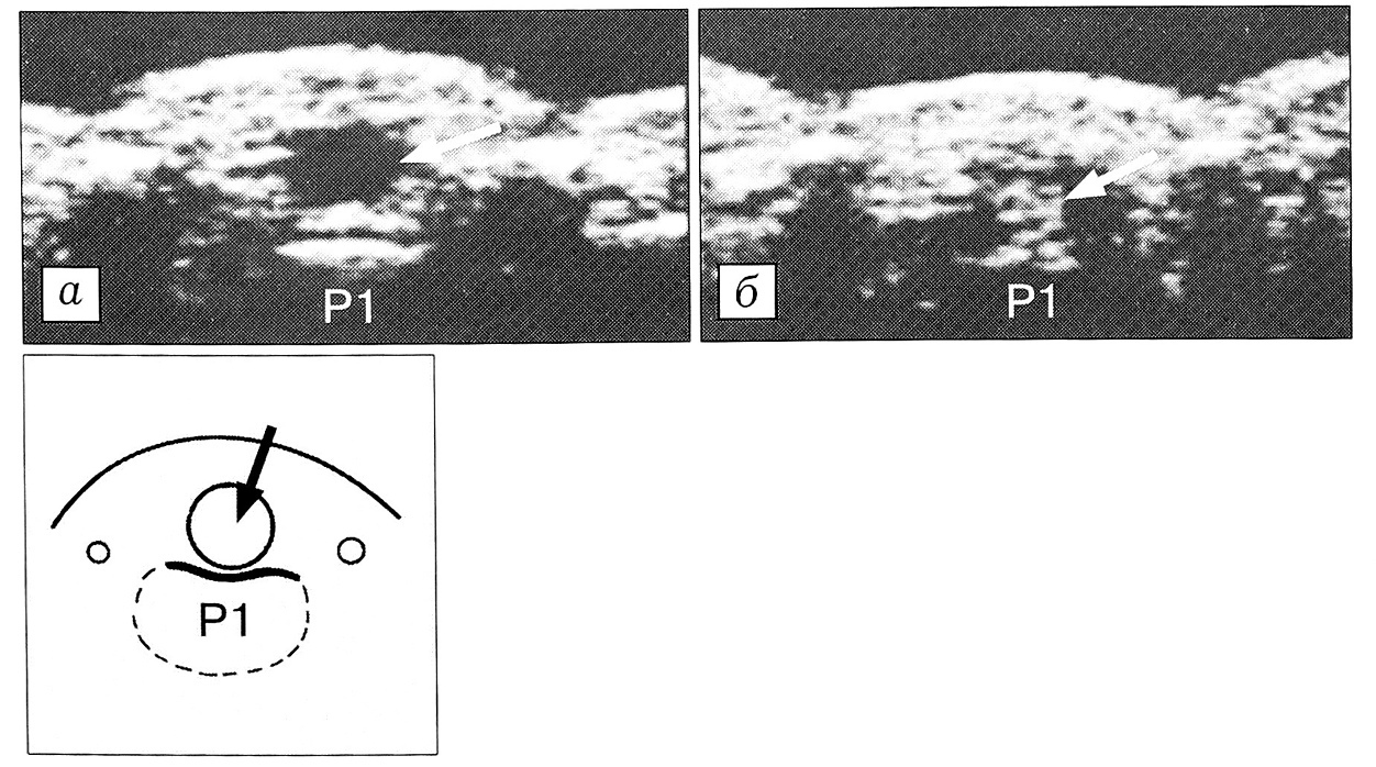 Рис. 5. Поперечные сонограммы сухожилий сгибателей дистальной трети проксимальной фаланги III пальца кисти (Р1 — проксимальная фаланга).а — некорректное, б — корректное расположение датчика (пояснения в тексте).