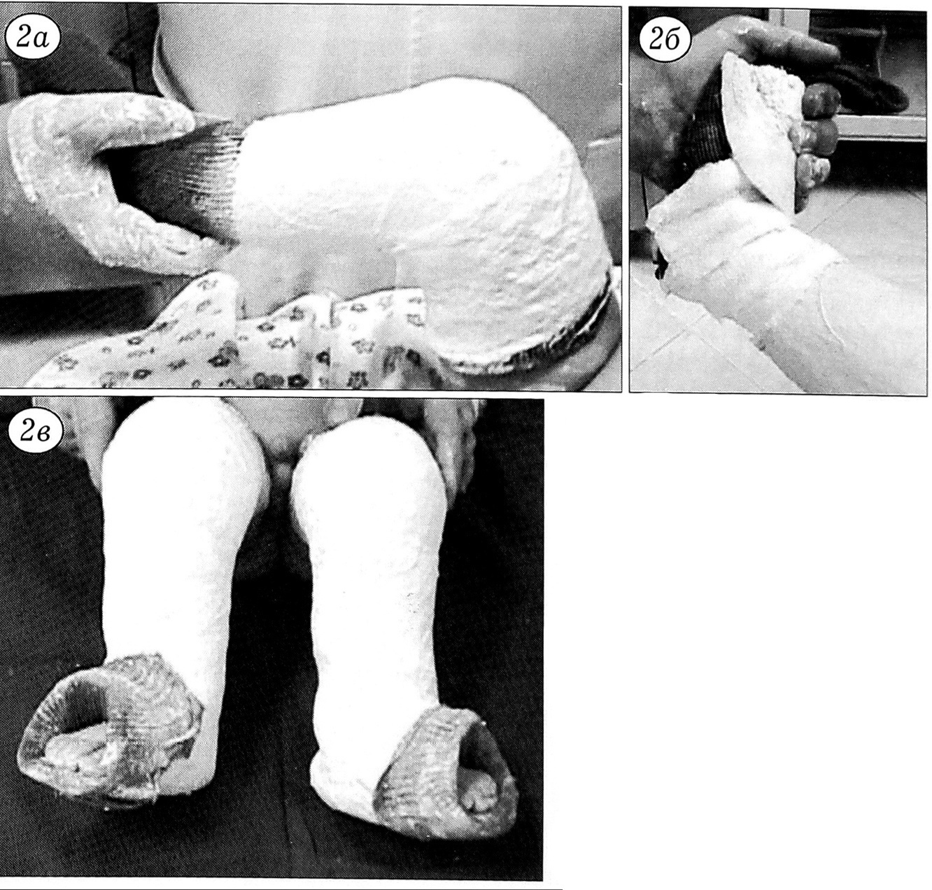 Рис. 2. Методика наложения функциональной гипсовой повязки. а — первый этап наложения повязки; б — пригипсовывание клиновидной прокладки из вспененной резины; в — готовая гипсовая повязка со свободным пространством.