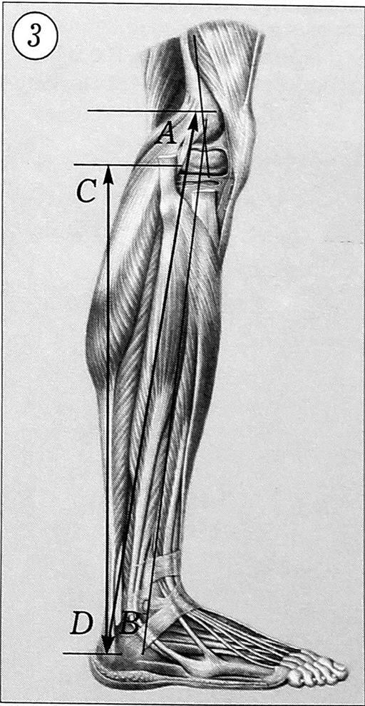 Рис. 3. Точки прикрепления икроножной мышцы (схема). А~В — расстояние между точками прикрепления икроножной мышцы при разогнутом коленном суставе, C~D — при согнутом под углом 90° коленном суставе.