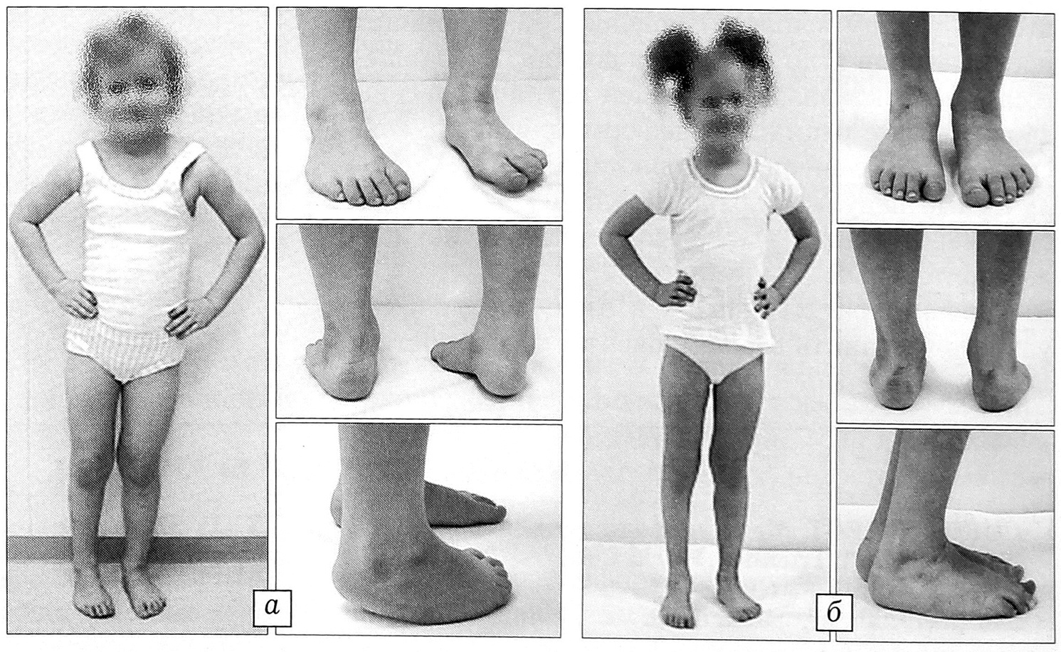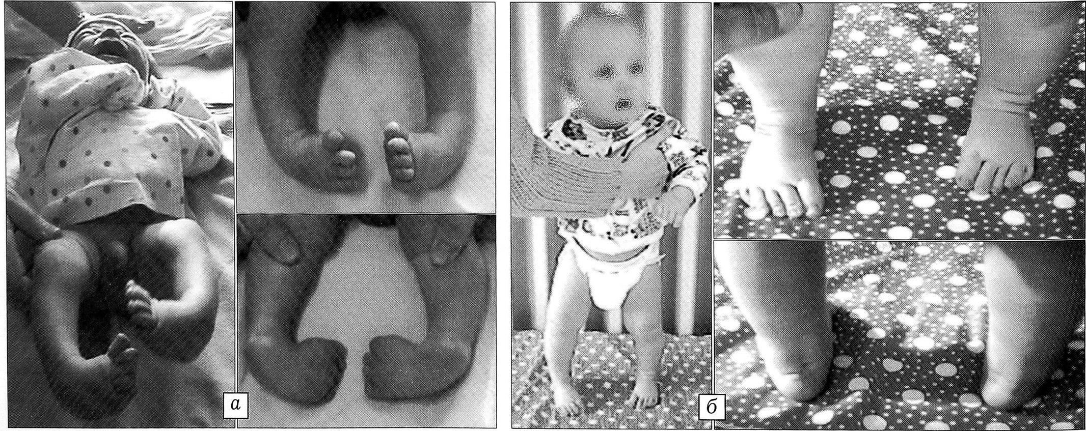 Рис. 4. Больной К., диагноз: врожденная двусторонняя косолапость, тяжелая степень. a — до лечения (возраст 10 дней); б — после консервативного лечения (возраст 9 мес).