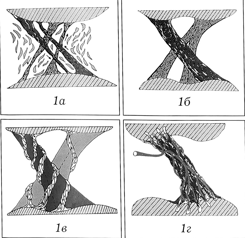 Рис. 1. Схемы закладки и первичной диф­ференцировки крестообразного комплекса человека. a — формирование четырех очагов поляризации фибробластов в скелетогенной мезенхиме (стрел­ками показаны направления поляризации); б — дифференцировка порций передней и зад­ней крестообразных связок; в — спиралевидная поляризация фибробластов на поверхности пучков; 2 — срастание связок и скелета при резорбции хряща остеокластами.