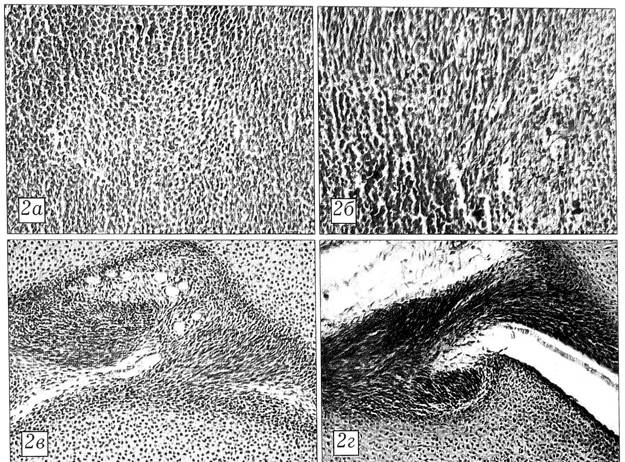 Первые признаки дифференциации передней и задней крестообразных связок обнаруживаются у эмбрионов 7,5-8 нед развития. В этот период связки выглядят как гетерогенное скопление клеток, соединяющее бедро и голень. В этом скоплении четко выделяются закладки передней и задней крестообразных связок, хотя они не имеют специализированных оболочек или цитологических различий. Их морфологическая обособленность заключается в различной ориентации поляризованных фибробластов, входящих в состав каждой из связок (рис. 2, в). В зоне скрещивания связок фибробласты расположены компактно, тогда как в местах прикрепления к бедру и голени они формируют веерные структуры. В этот период различить морфогенетические компоненты связок, найденные при их закладке, не удается.