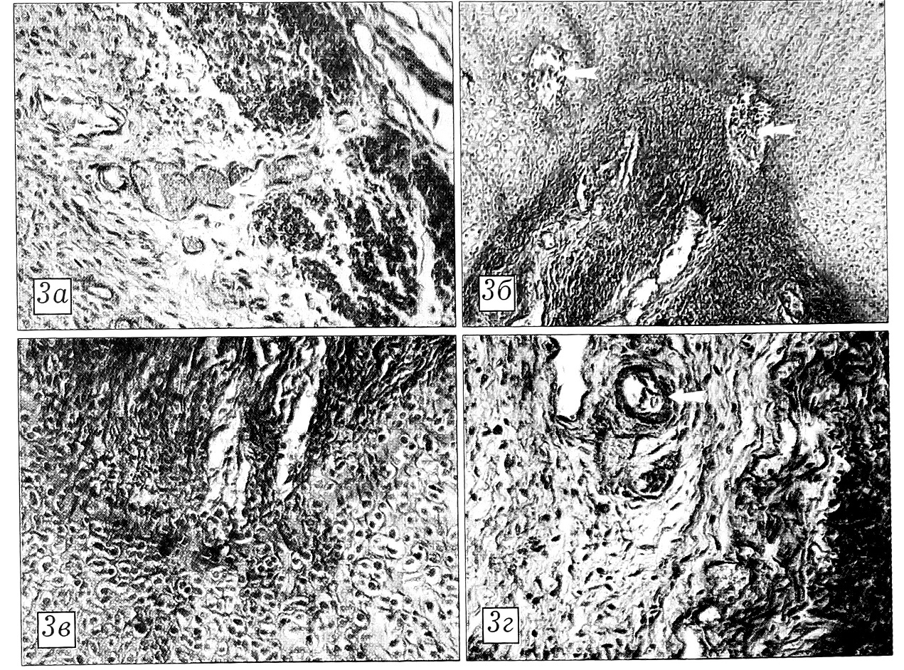 4. Рис. 3. Гистология дифференцировки крестообразного комплекса коленного сустава человека.а — диффренцировка сосудов в крестообразном комплексе у эмбриона 10 нед. Стрелка указывает на «рассечение» сосудами фибробластного тела связки (окраска по Маллори, об. 40); б — формирование каналов в хряще бедра активными остеокластами у эмбриона 11,5 нед. Стрелки указывают на каналы в краевой части голени (окраска по Маллори, об. 40); в — врастание васкуляризированной передней крестообразной связки в края хрящевого канала бедра у эмбриона 12,5 нед (окраска по Маллори, об. 40); г — проникновение нервных волокон в крестообразный комплекс у эмбриона 13,5 нед. Стрелка указывает на единичное волокно в задней связке крестообразного комплекса (окраска по Маллори, об. 40).
