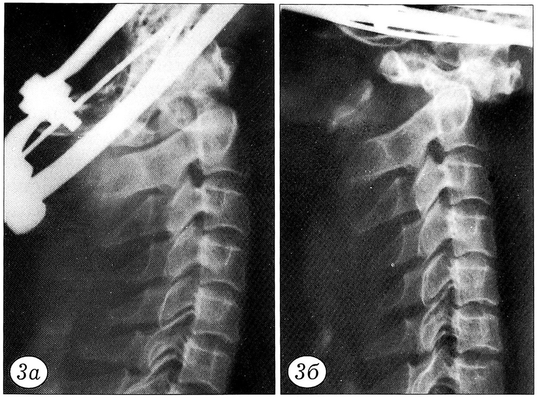 - При повреждениях краниовертебрального сегмента, не сопровождающихся дислокацией позвонков, показана фиксация шейного отдела голово- держателем с налобным фиксатором или гало-ап- паратом. При дислокации позвонков необходимы ее устранение и открытое стабилизирующее оперативное вмешательство.