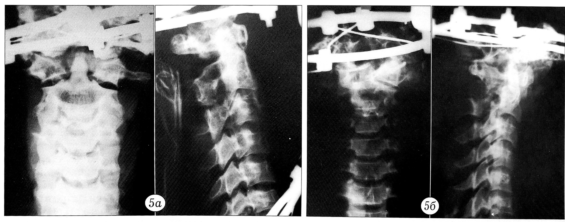 Результаты экспериментального исследования подтверждены анализом клинического материала. В отделении патологии позвоночника ЦИТО лечились 42 больных с различными повреждениями верхнешейного отдела позвоночника: 18 пациентов с переломами зубовидного отростка С2 позвонка, 12 с переломами дуг С2 позвонка, 3 с переломами Джефферсона, 3 с вывихами С2 позвонка, 4 с застарелыми ротационными подвывихами С1 позвонка и 2 с одновременными переломами С1 и С2 позвонков. У большинства больных была применена фиксация в гало-аппарате, которая позволила достичь сращения переломов без вторичной дислокации позвонков. Оперативная стабилизация с помощью металлоконструкций произведена в 5 случаях. В 2 случаях использована система CCD Cervical (при переломе «палача» типа 3 и при переломе зубовидного отростка типа 2, осложненном полным трансдентальным вывихом атланта), в 1 случае при переломе зубовидного отростка типа 2 — система Apofix, в 2 случаях стабилизация верхнешейного отдела произведена с помощью аутотрансплантатов и проволоки (при переломе зубовидного отростка типа 2 с задним трансдентальным вывихом и при вывихе С2 позвонка).