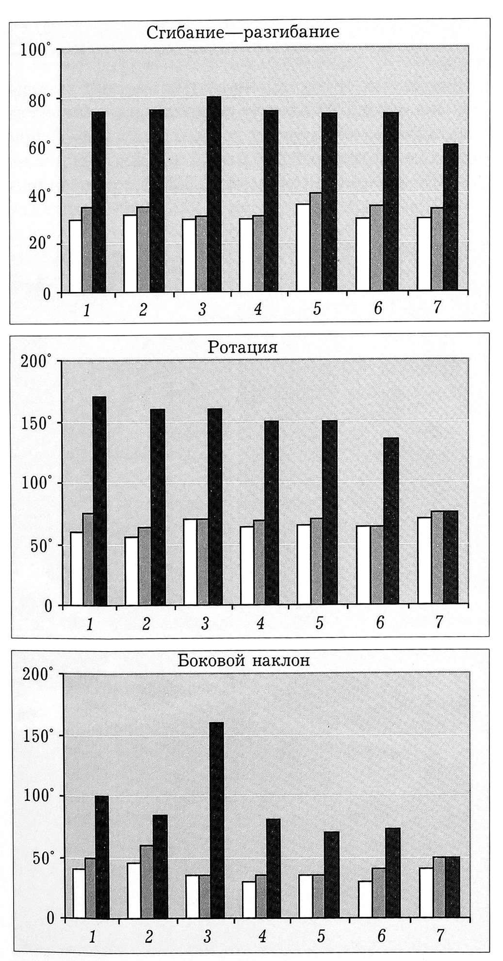 Как видно из рис. 6, после моделирования всех изучаемых видов повреждений объем ротации, бокового наклона и сгибания—разгибания увеличивался незначительно и только после применения нагрузки, приведшей к дислокации позвонков на 20-60 мм, определялась выраженная нестабильность краниовертебральных блоков. Из этого следует, что повреждения верхнешейного отдела позвоночника, не сопровождающиеся дислокацией позвонков, можно лечить, не прибегая к открытым оперативным вмешательствам. Применения гало- аппарата или головодержателя с налобным фиксатором достаточно для создания жесткой фиксации и сращения перелома в правильном положении. При повреждениях, сопровождающихся дислокацией позвонков, показаны устранение дислокации и открытая стабилизация.