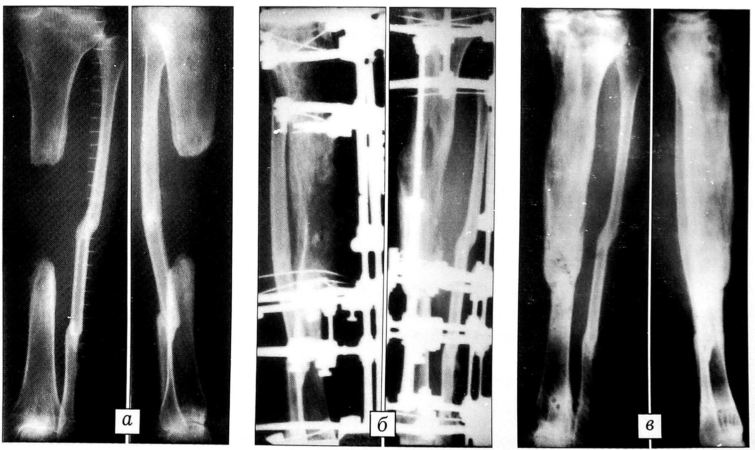 Рис. 4. Рентгенограммы больного К. 26 лет.a — до лечения; б — в процессе остеосинтеза; в — после снятия аппарата.
