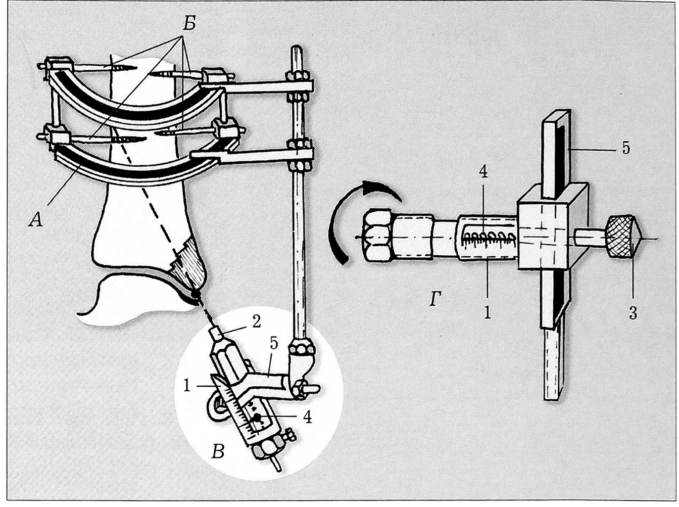 Система, обеспечивающая одностороннее давление на костный отломок (рис. 1), состоит из внешней опоры (А), противоупорных фиксаторов (Б) и компрессирующего устройства (В, Г). Последнее представляет собой корпус со шкалой в виде втулки с прорезью (1), в которой установлен подпружинный толкатель; на корпусе имеется гайка (2) или цанговый фиксатор (3). На стержне установлена пружина (4), которая контактирует с дном втулки и пластиной кронштейна (5).