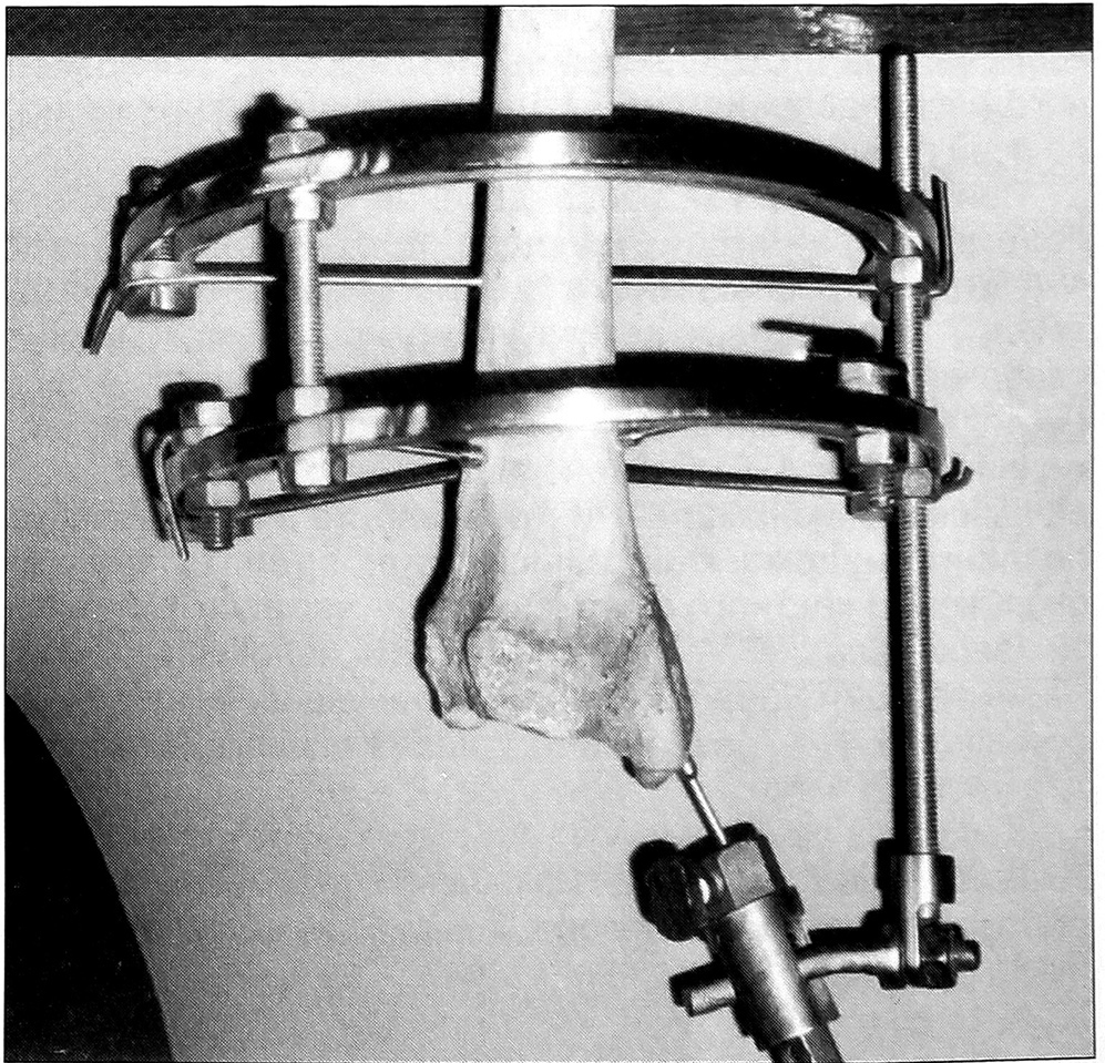 Экспериментальные исследования выполнены на кафедрах сопротивления материалов и физики твердого тела Ульяновского технического университета. Эксперименты проводили на проксимальных и дистальных сегментах плечевой и большеберцовой костей, взятых от трупов лиц 55-60 лет 2-3-дневной давности. Перелом имитировали косым распилом мыщелков плечевой, большеберцовой костей и внутренней лодыжки на расстоянии 2,5-5 см от их суставного края. Затем отломки сопоставляли и фиксировали спицей (2 мм) с упорной площадкой (рабочая площадка 4 мм). Спицу укрепляли в компрессирующем устройстве. На расстоянии 3-4 см от метафизарного края линии перелома транссегментарно во фронтальной плоскости на двух уровнях перекрестно проводили спицы с упорным;* площадками со стороны, противоположной повреждению. Спицы фиксировали в натянутом положении на внешней опоре. Последняя посредством резьбовой штанги соединялась с компрессирующим устройством. Завершали монтаж системы обеспечением полного контакта отломка с поверхностью излома сегмента и его компрессией (рис. 2).