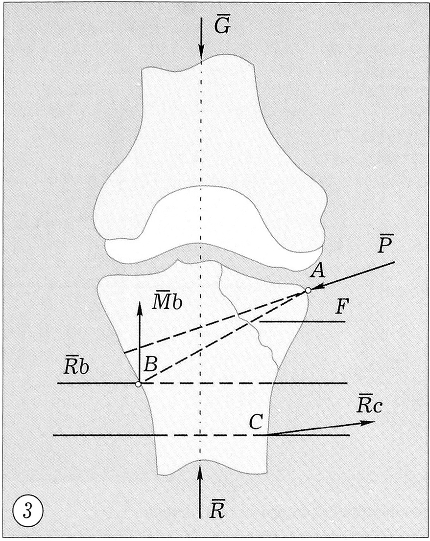 Для удобства расчетов мы ввели следующие биомеханические параметры распределения сил: G — часть силы тяжести (веса тела), воспринимаемая сегментом конечности; R = G — реакция, уравновешивающая силу тяжести G; Р — сила компрессии, приложенная в точке 4; Rb — напряжение противоупора, приложенное в точке В; Mb — момент сил, создаваемый противоупором в точке В; Rc — напряжение опоры в точке С; F — плоскость излома кости.